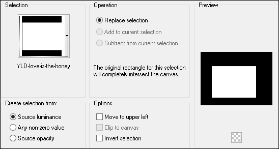 STEP 18 Layers >> New Raster Layer Selections >> Load/Save Selections >> Load Selection from Disk Select YLD-love-is-the-honey.PspSelection from the dropdown list